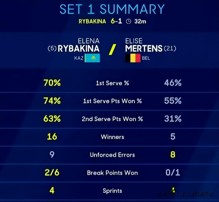技术统计显示莱巴金娜的压倒性优势。 她全场打出32个制胜分,而梅尔滕斯难以招架其发球和底线进攻。 莱巴金娜不仅发球强劲,在底线相持中也表现出色,完全掌控了比赛节奏。